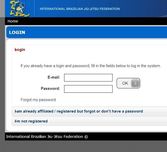 こちらにIBJJFカードで登録したメールアドレスとパスワード(事前に登録されたメールに届いております)をご記入ください。もしパスワードをお忘れの方は下の欄にあります、「I`m already affiliated / registered but forgot or don`t have a passwaord」をクリックしパスワードを再発行してください。